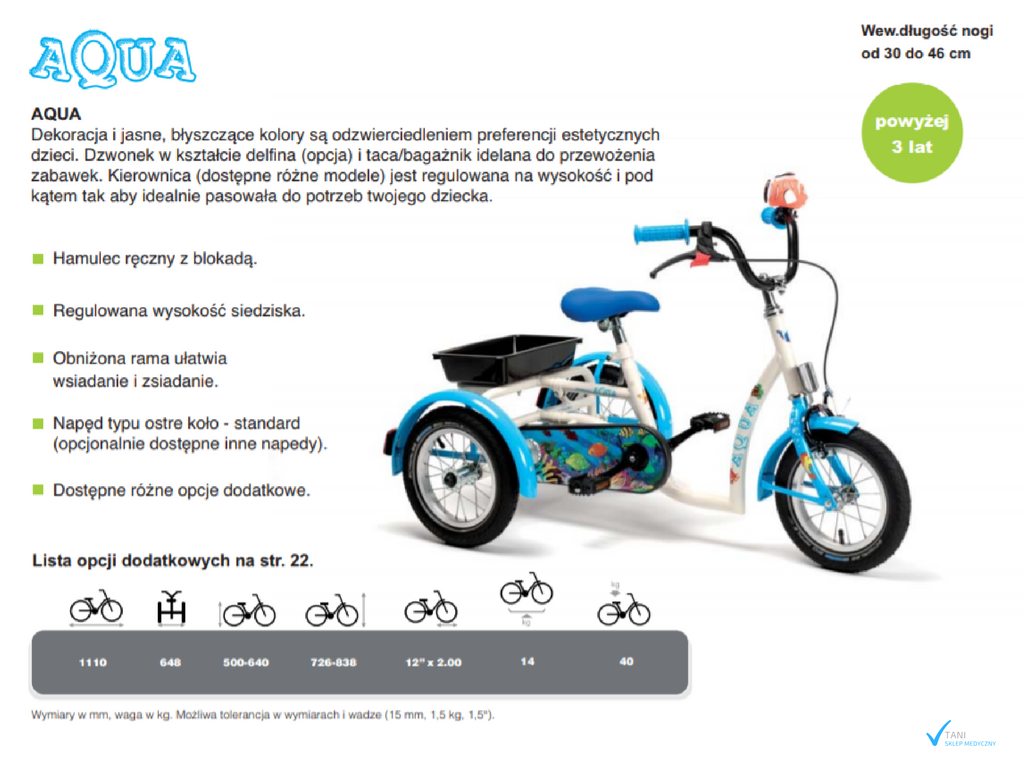 Cena dotyczy rowerka Aqua wersji podstawowej, wszelkie opcje dodatkowe są płatne. Ceny w formularzu zamówienia. Termin realizacji ok.30 dni( Poniżej - plik do pobrania)