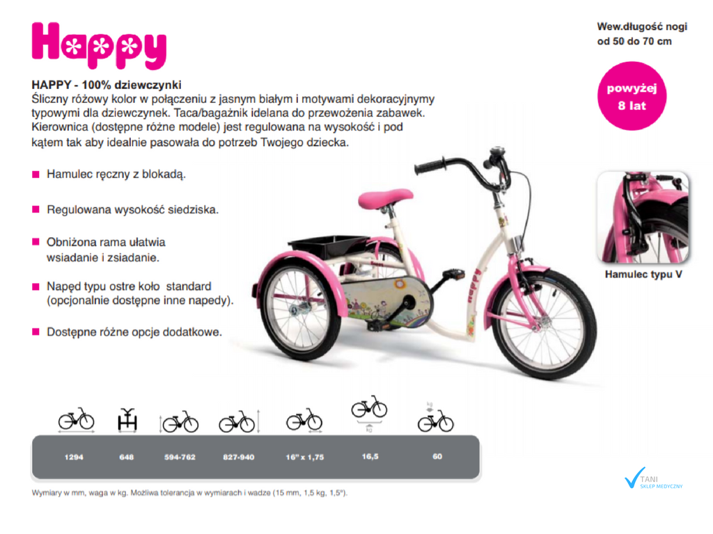 Rowerek rehabilitacyjny trójkołowy HAPPY przeznaczony jest dla dziewczynek w wieku 8-13 lat. Dzięki swej wyjątkowej kolorystyce oraz ozdobom sprawia, że rowerek jest dedykowany dla dziewczynek.