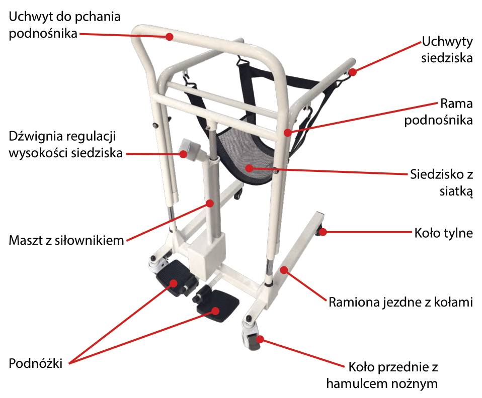 Sprzęt pomocniczy przeznaczony jest dla osób z dysfunkcjami narządu ruchu, ułatwiający (najazd nad sedes) lub w ograniczonym zakresie do transportu osób z niepełnosprawnościami ruchowymi wewnątrz pomieszczeń.