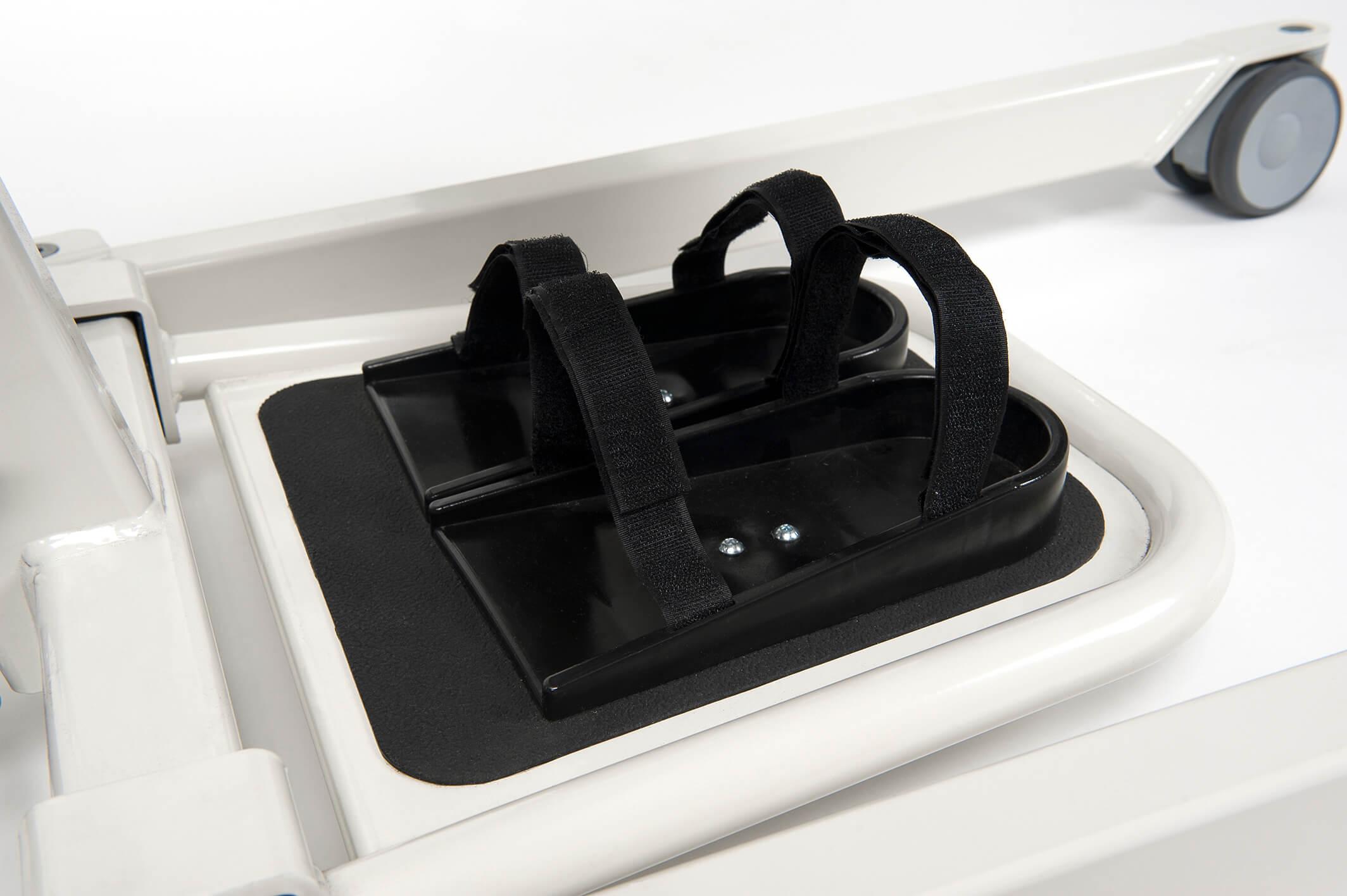 - Odpowiednia platforma na stopy wyposażona w antypoślizgowe wkładki oraz prawidłowe wsparcie kolan z psem zabezpieczającym łydki doskonale stabilizuje nogi. Jeżeli jest wymagana większa stabilizacja stóp można zastosować specjalne korytka na stopy z paskami stabilizacyjnymi.