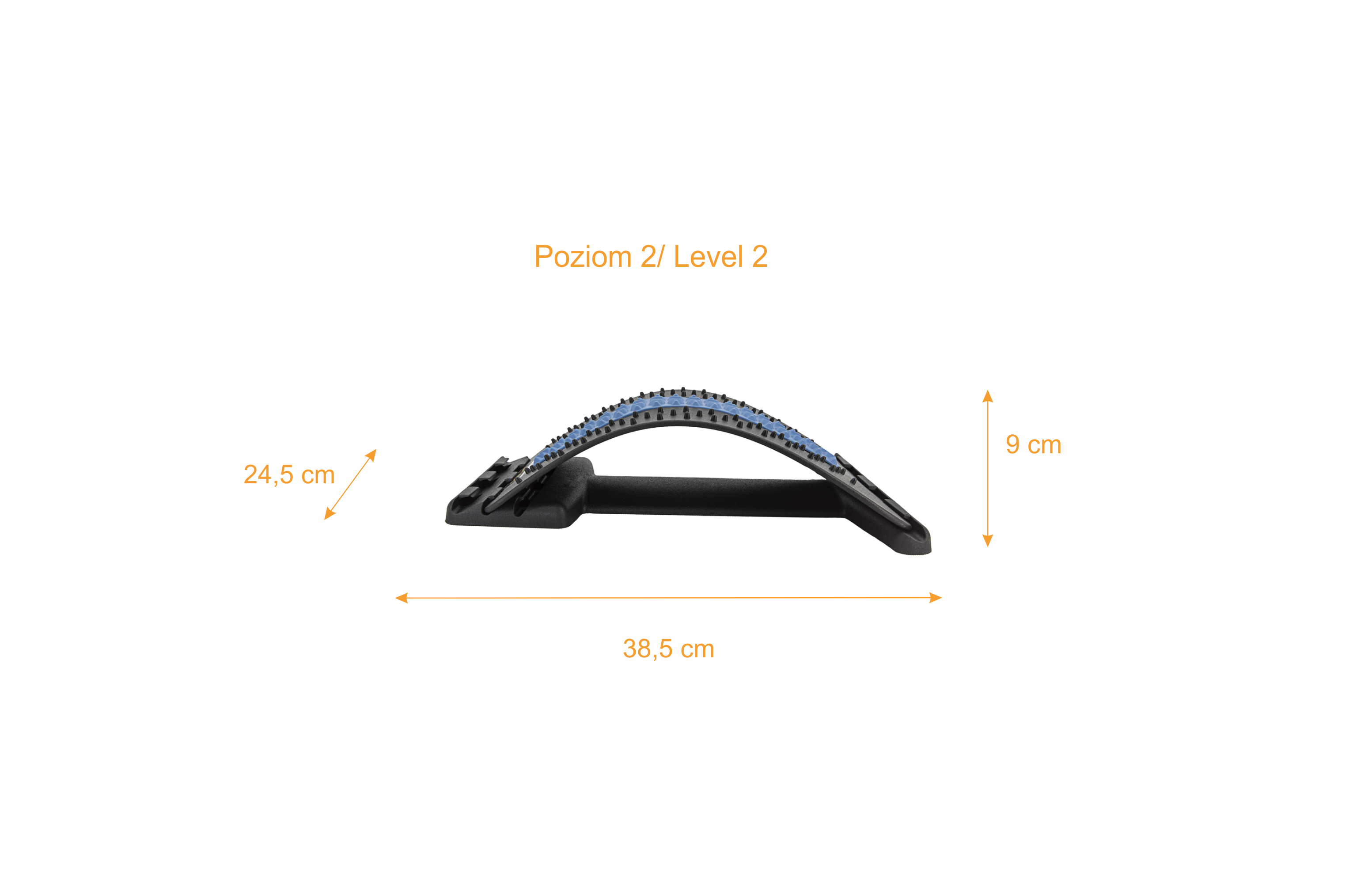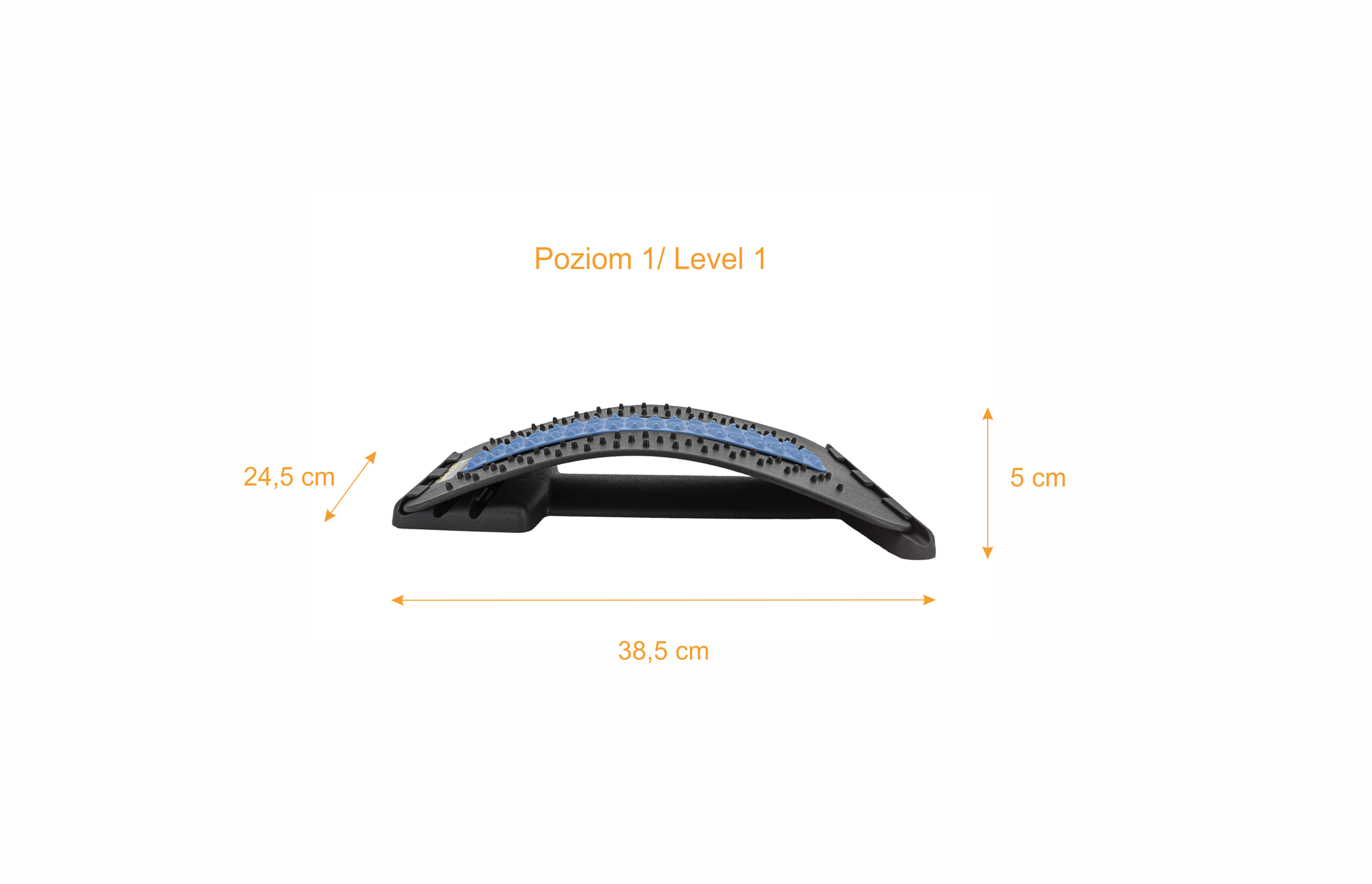 Zamocuj łuk podporowy na wybranym poziomie i połóż produkt na macie. Szersza krawędź wyrobu powinna znajdować się blisko podstawy kręgosłupa, tak aby łuk podporowy wspierał odcinek lędźwiowy pleców, a węższa krawędź produktu skierowana była w stronę głowy. Zawsze używaj produktu skierowanego w odpowiednią stronę. Usiądź plecami w stronę produktu i powoli połóż się na nim z ugiętymi kolanami. Spróbuj wyśrodkować kręgosłup na niebieskiej taśmie, która jest zaprojektowana tak, aby obejmowała go wygodnie i zapewniała dodatkowy komfort. Jeśli potrzebujesz, możesz umieścić poduszkę pod głową, aby zwiększyć swoją wygodę lub gdy podczas rozciągania się na produkcie Twoja głowa nie dotyka do podłoża.