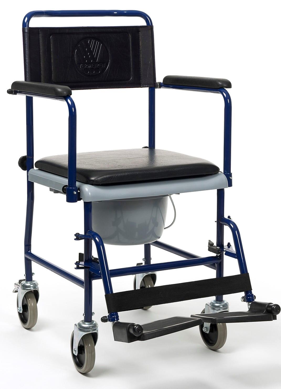 Wózek toaletowo- transportowy model 139 belgijskiej firmy Vermeiren z wyjmowanym pojemnikiem sanitarnym. Po wyciągnięciu pojemnika spod siedziska, wózkiem z powodzeniem można najeżdżać na sedes.